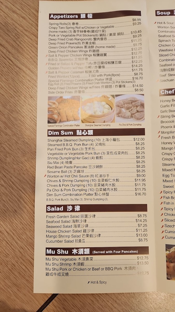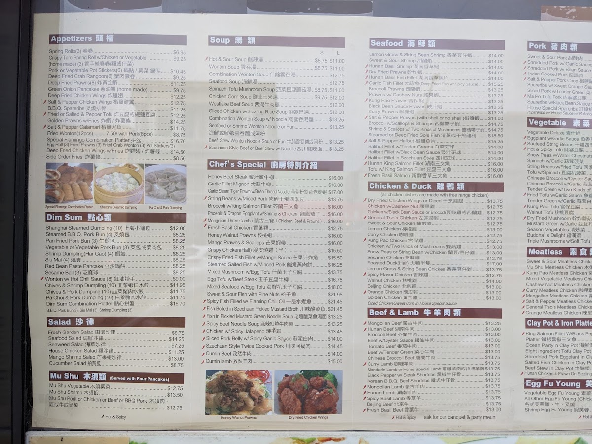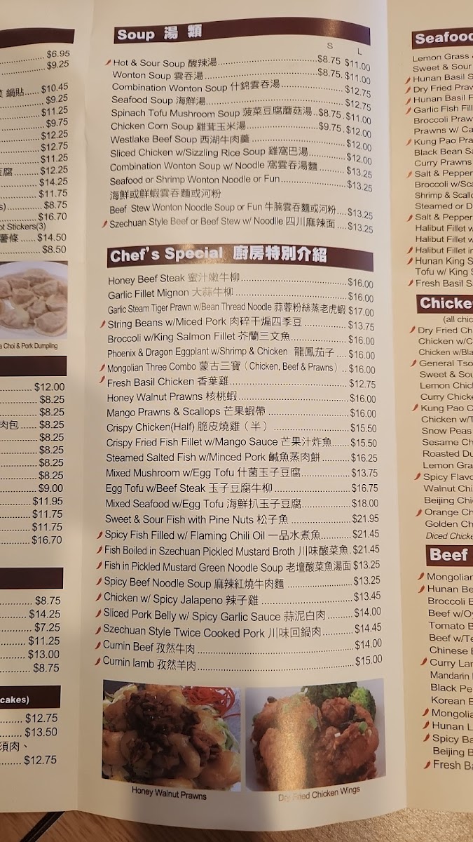 Additional menu highlights include specialty items like Shanghai Steamed Dumpling, Lemon Shrimp with String Beans, Twice Cooked Pork, Hot and Sour Soup, Mandarin or Home Special Lamb, Honey Walnut Prawns and Shrimp, Braised Tofu, Pepper Steak, Sweet and Sour Pork, and other traditional Chinese entrees.