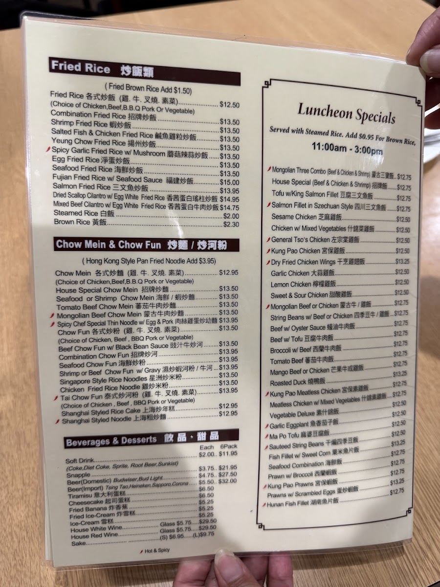 Chow Mein and Chow Fun: Noodle dishes come in both chow mein and chow fun styles, with choices of chicken, beef, BBQ pork, vegetable, seafood, or shrimp. Notable dishes include House Special Chow Mein, Mongolian Beef Chow Mein, Tomato Beef Chow Mein, Spicy Chef Special Thin Noodle, and Beef Chow Fun with Black Bean Sauce.